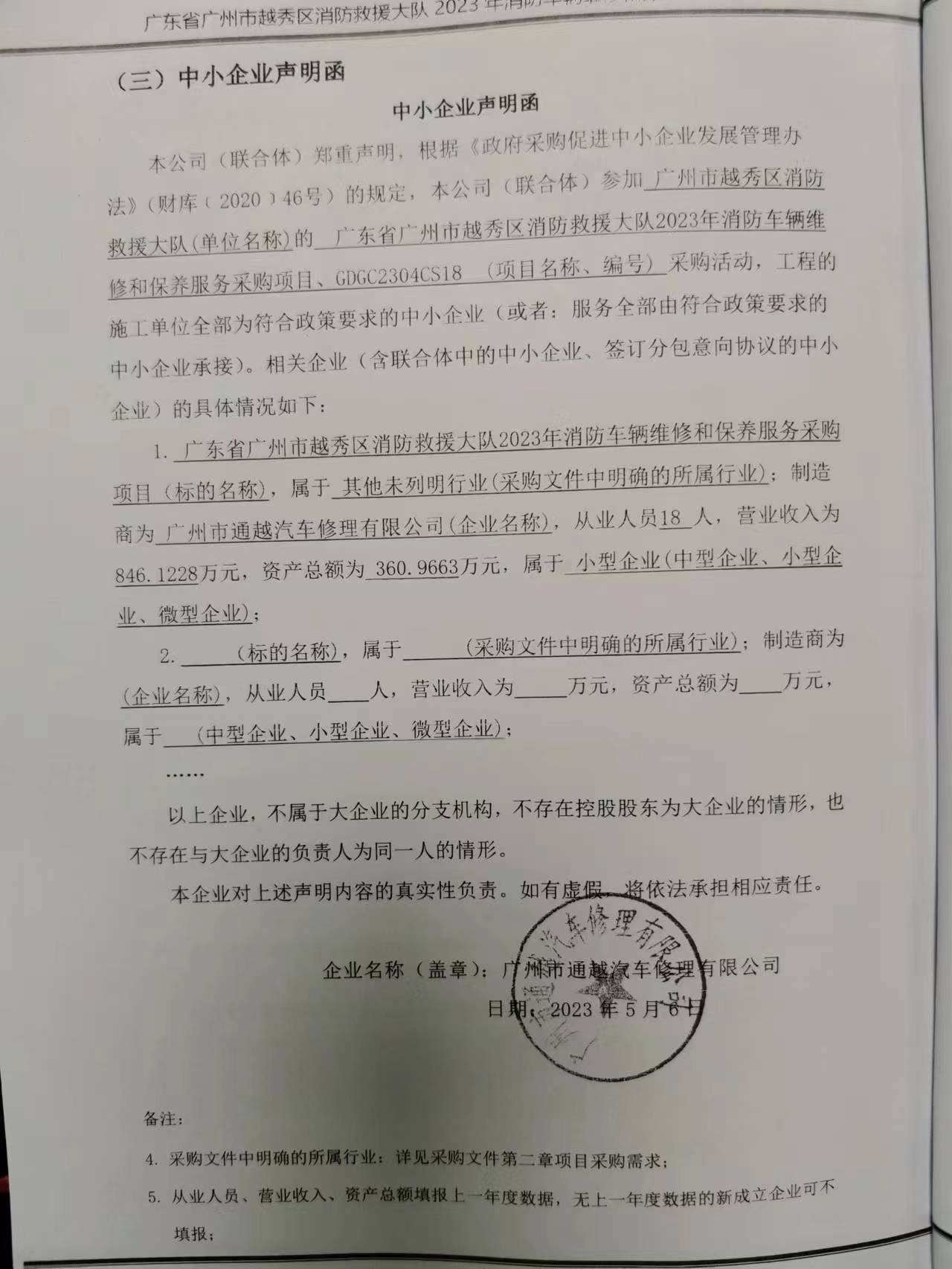 | 2 | 廣州市通越汽車修理有限公司 | 廣東省廣州市越秀區(qū)消防救援大隊(duì) 2023 年消防車輛維修和保養(yǎng)服 務(wù)采購(gòu)項(xiàng)目 | 消防車輛維修、維護(hù)保養(yǎng),包括提供車輛一級(jí)維護(hù)、二級(jí)維護(hù)、總成修理、車輛小修 和車輛專項(xiàng)修理、二十四小時(shí)免費(fèi)拖車服務(wù)和其他有關(guān)的消防車維修服務(wù)項(xiàng)目。 | (一)場(chǎng)地及設(shè)施要求 1. 場(chǎng)地符合國(guó)家規(guī)定的標(biāo)準(zhǔn)要求,停車場(chǎng)出入口及通道能自由進(jìn)出寬度 3.2M,高度 4.2M 的車輛,維修車間能存放長(zhǎng)度 15.4M,寬度 3.2M,高度 4.2M 的車輛,并且交通便利(或 設(shè)有合理、明顯的指示標(biāo)志); 2. 修理車間布局合理、車間設(shè)施良好、修理工位標(biāo)示明確; 3. 企業(yè)各功能區(qū)標(biāo)志清晰,企業(yè)資質(zhì)證明、員工資格證明、營(yíng)業(yè)時(shí)間要明確展示; 4. 保留足夠的停車場(chǎng)地和接待區(qū),接待區(qū)要有滿足客戶登記和休息的設(shè)施。 (二)經(jīng)營(yíng)要求 1. 日常運(yùn)作(接車、維修、交車、結(jié)算、投訴、索賠)要做到規(guī)范化、制度化,實(shí) 行定人定崗,嚴(yán)格落實(shí)崗位責(zé)任制度,形成崗位責(zé)任追究制度,促進(jìn)生產(chǎn)管理活動(dòng)有秩序 地進(jìn)行。 2. 接受委托維修時(shí),維修項(xiàng)目和維修費(fèi)用(工時(shí)費(fèi)和配件費(fèi))都必須由采購(gòu)人簽名 認(rèn)可,成交供應(yīng)商在標(biāo)價(jià)時(shí),應(yīng)編制維修項(xiàng)目明細(xì)表,確保采購(gòu)人對(duì)維修內(nèi)容及其細(xì)節(jié)的 廣東省廣州市越秀區(qū)消防救援大隊(duì) 2023 年消防車輛維修和保養(yǎng)服務(wù)采購(gòu)項(xiàng)目 項(xiàng)目編號(hào): GDGC2304CS18 第 12 頁(yè) 共 100 頁(yè) 廣東公采招標(biāo)有限公司 編制 知情權(quán)。 3. 響應(yīng)供應(yīng)商對(duì)采購(gòu)人車輛應(yīng)當(dāng)優(yōu)先安排維修,車輛小修、保養(yǎng)當(dāng)天完成,車輛在 修時(shí)間整車維修不超過(guò) 10 天,總成維修不超過(guò) 5 天。需疑難零配件的特殊車輛維修或試 過(guò)出險(xiǎn)車輛維修,應(yīng)視籌措配件難易程度或車輛損傷程度,由雙方協(xié)調(diào)維修工期。 4. 檢驗(yàn)人員必須在現(xiàn)場(chǎng)對(duì)車輛進(jìn)行診斷,初步確定維修項(xiàng)目,并要充分征求采購(gòu)人 的意見。 5. 工作單上沒(méi)有的項(xiàng)目,在維修過(guò)程中發(fā)現(xiàn)某些項(xiàng)目是必須追加的,維修人員應(yīng)立 即告知調(diào)度或技術(shù)負(fù)責(zé)人,確認(rèn)后,在維修前應(yīng)事先通知采購(gòu)人,征得采購(gòu)人同意,方能 增加費(fèi)用開始施工,并同時(shí)要追加工作單或在原工作單上補(bǔ)項(xiàng)。 6. 零配(部)件要求:所采用的零配(部)件等材料必須符合國(guó)家標(biāo)準(zhǔn),不得使用 假冒偽劣產(chǎn)品或以次充好,以舊頂新。特殊情況下,經(jīng)送修人同意,在保證安全質(zhì)量的前 提下,可以用舊件或副廠件。不論何種情況更換的零配(部)件均應(yīng)在裝配前取得送修人 認(rèn)可并在維修單上簽字同意。消防車修理企業(yè)必須在材料電腦清單中注明為原廠件或副廠 件或舊件。 7. 對(duì)可以維修的部件,不得以換代修;不得與任何人串通,虛假修車或虛報(bào)維修項(xiàng) 目,損害車屬單位的利益,嚴(yán)禁送修人員或單位向響應(yīng)供應(yīng)商提出非分要求。需要更換的 新部件(單件 200 元以上、成套 500 元以上)要制檔備查,妥善保管好每一輛維修車所更 換的舊件(必須與要換的新部件相符,如送修單位需要舊件,簽字后可取回),單一打包, 統(tǒng)一存放,到了一定批量時(shí),采購(gòu)人根據(jù)該車輛維修電腦清單逐一審核、處理,未經(jīng)審批 不得擅自丟棄。 8. 汽車竣工出廠后,成交供應(yīng)商應(yīng)建立采購(gòu)人檔案(包括用戶名稱、地址、電話、 聯(lián)系人、車牌號(hào)、維修資料等),以便今后聯(lián)系、調(diào)查和服務(wù)。 9. 汽車竣工出廠后,責(zé)任保障期限及車輛質(zhì)量保障按照國(guó)家有關(guān)部門頒發(fā)的最新標(biāo) 準(zhǔn)執(zhí)行。 10. 在質(zhì)量保證期內(nèi)(質(zhì)量保證期:自維修完成一年內(nèi)),因維修質(zhì)量造成的車輛故 障或損壞的,成交供應(yīng)商應(yīng)負(fù)責(zé)及時(shí)返修,由于維修質(zhì)量問(wèn)題造成的車輛異常損壞或車輛 機(jī)件事故的,由成交供應(yīng)商負(fù)責(zé)。 11. 成交供應(yīng)商不得以任何借口動(dòng)用消防車,未經(jīng)采購(gòu)人允許不得將車開出廠試車或 作它用。 12. ★響應(yīng)供應(yīng)商承諾對(duì)采購(gòu)人車輛實(shí)行應(yīng)急救援服務(wù)、上門維修服務(wù)和 24 小時(shí)服 務(wù);當(dāng)采購(gòu)人車輛在營(yíng)區(qū)內(nèi)發(fā)生故障,響應(yīng)供應(yīng)商應(yīng)在采購(gòu)人提出維修需求后 1 小時(shí)提供 廣東省廣州市越秀區(qū)消防救援大隊(duì) 2023 年消防車輛維修和保養(yǎng)服務(wù)采購(gòu)項(xiàng)目 項(xiàng)目編號(hào): GDGC2304CS18 第 13 頁(yè) 共 100 頁(yè) 廣東公采招標(biāo)有限公司 編制 上門維修服務(wù);在廣州市行政區(qū)域,采購(gòu)人車輛發(fā)生故障需急修的,響應(yīng)供應(yīng)商應(yīng)及時(shí)派